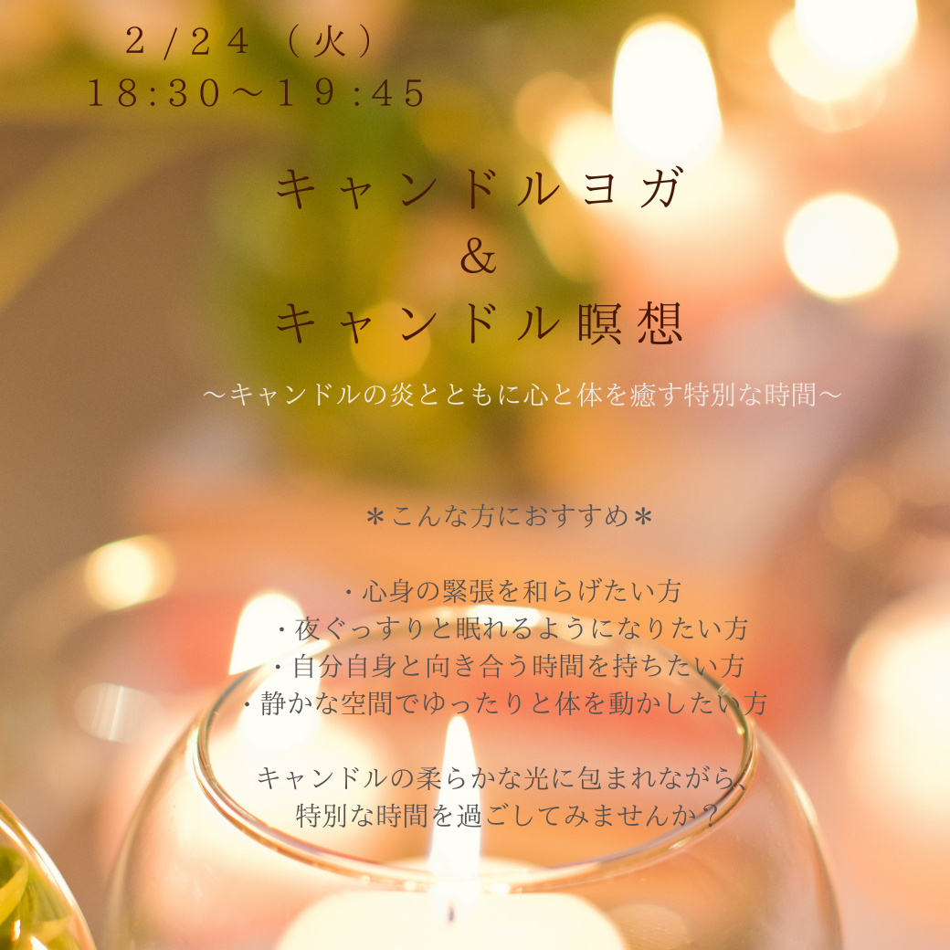 AUN YOGA STUDIOでは、ご好評につき「キャンドルヨガ」を2月も開催いたします。やさしく揺れるキャンドルの灯りの中で呼吸を整え、心と身体を静かにほどいていく時間。