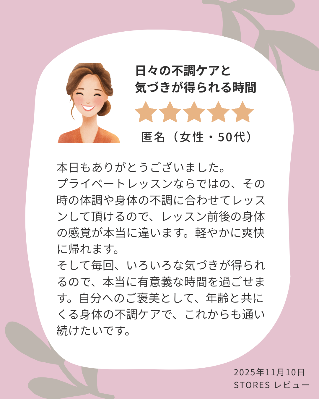 プライベートではご自身に合わせたオーダーメイドの内容で、深く寄り添う時間になります。