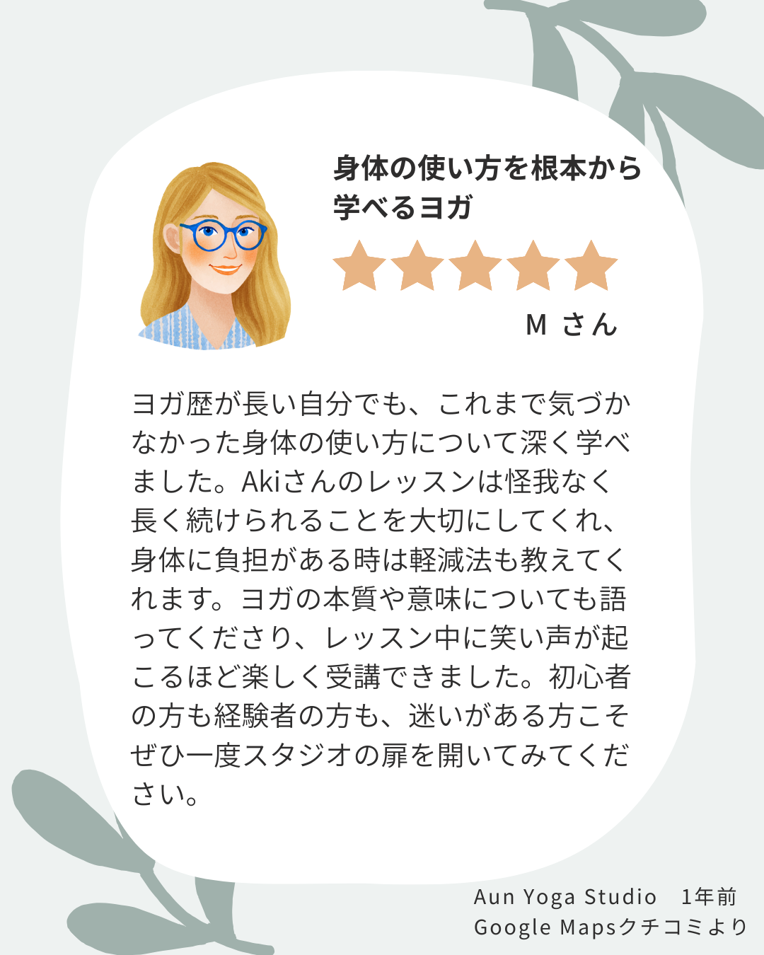 AUN YOGAでは、すべてのクラスを一人の講師が担当します。 だからこそ、継続して通う中で、あなたの体や心の変化をしっかり見守り、寄り添うことができます。
