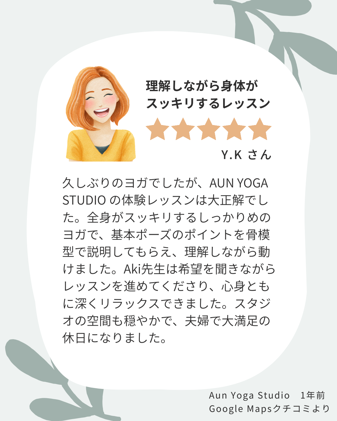 2023年よりフリーの講師として活動をはじめ、念願のAUN YOGA STUDIOを設立。